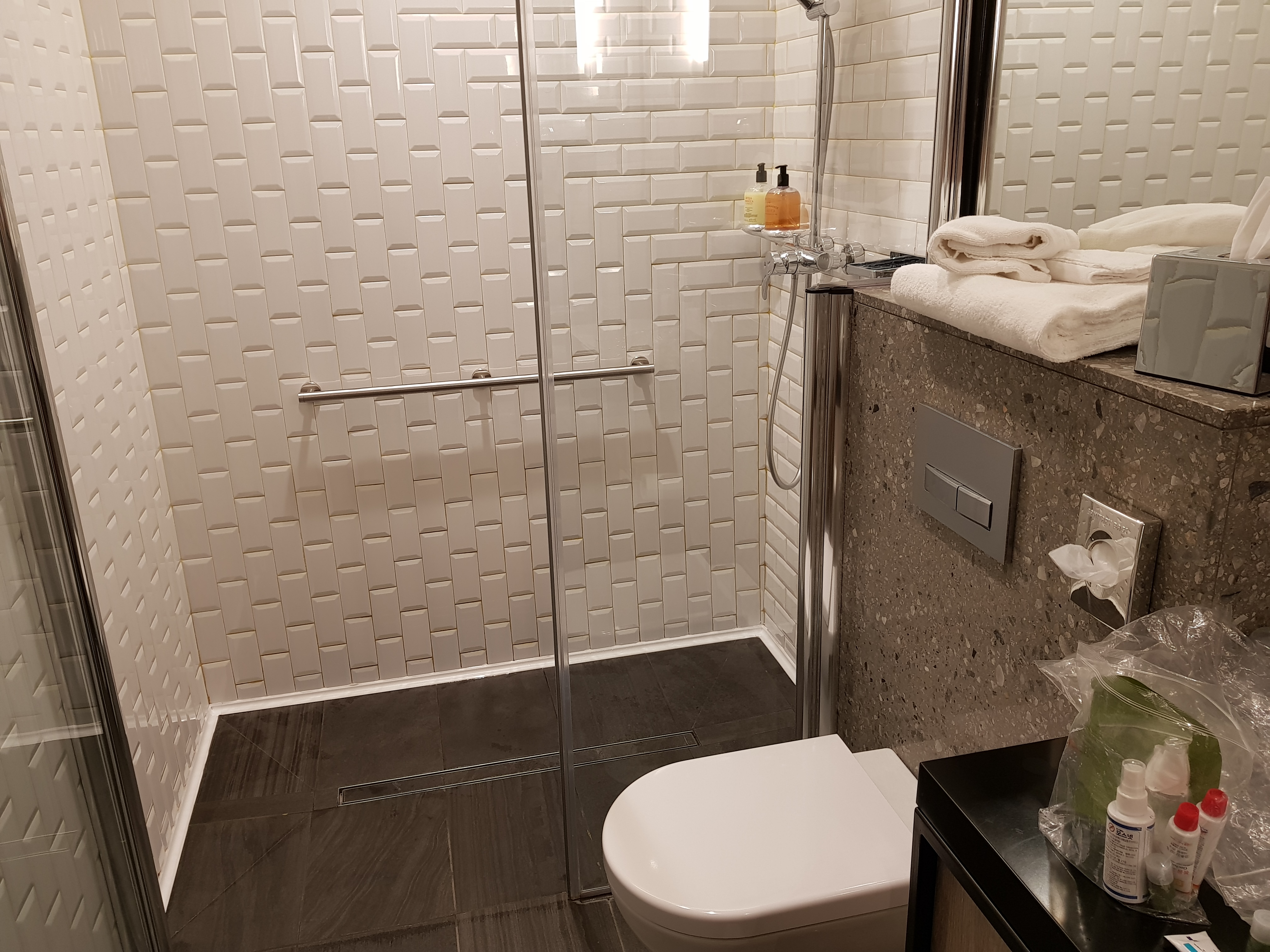 내부에 수건이 제공되었고 별도 어메니티는 제공되지 않고 공용 샴푸와 바디워시가 있었다.