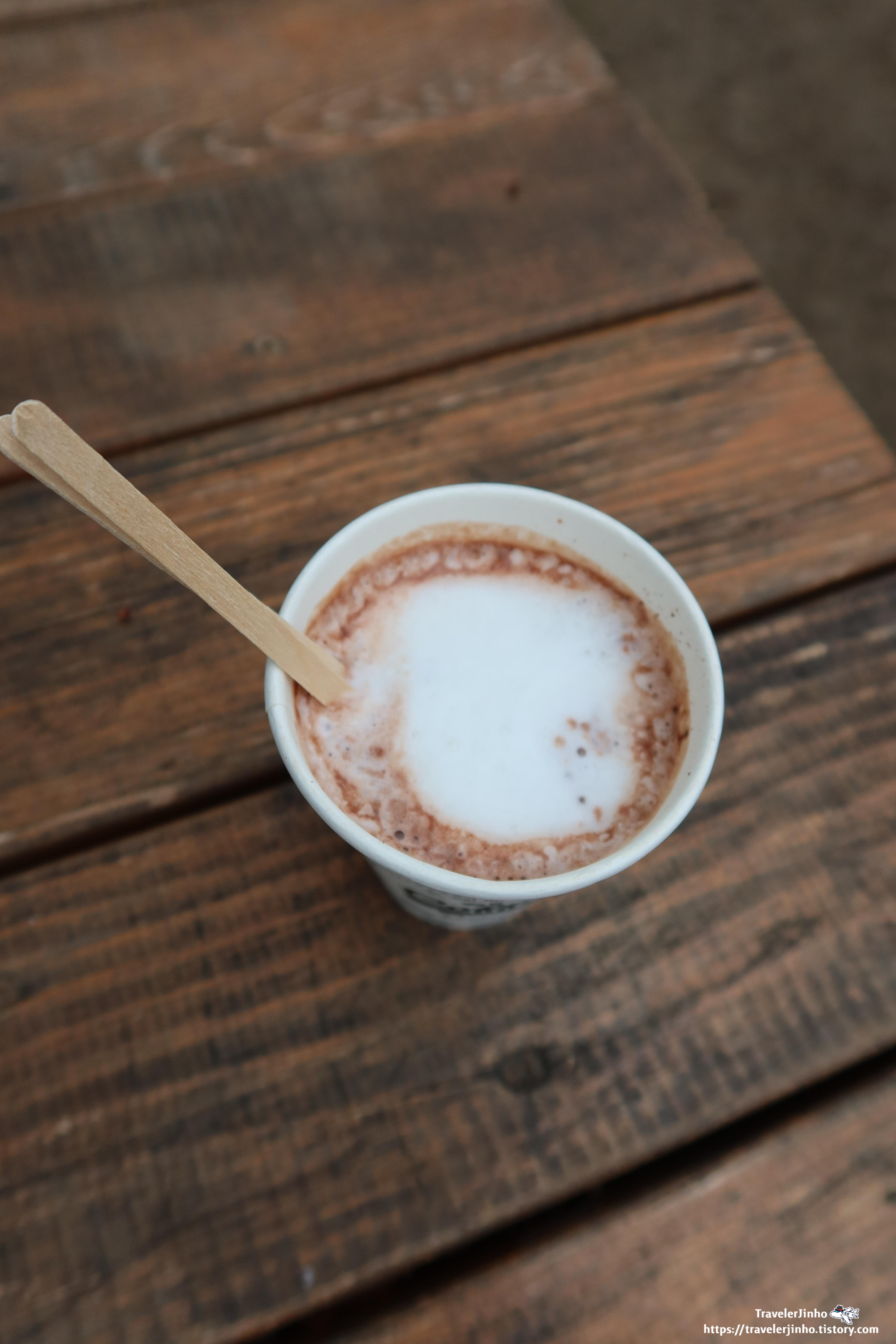 자리를 잡고 핫초코를 구매해서 사 온 빵과 먹었다.