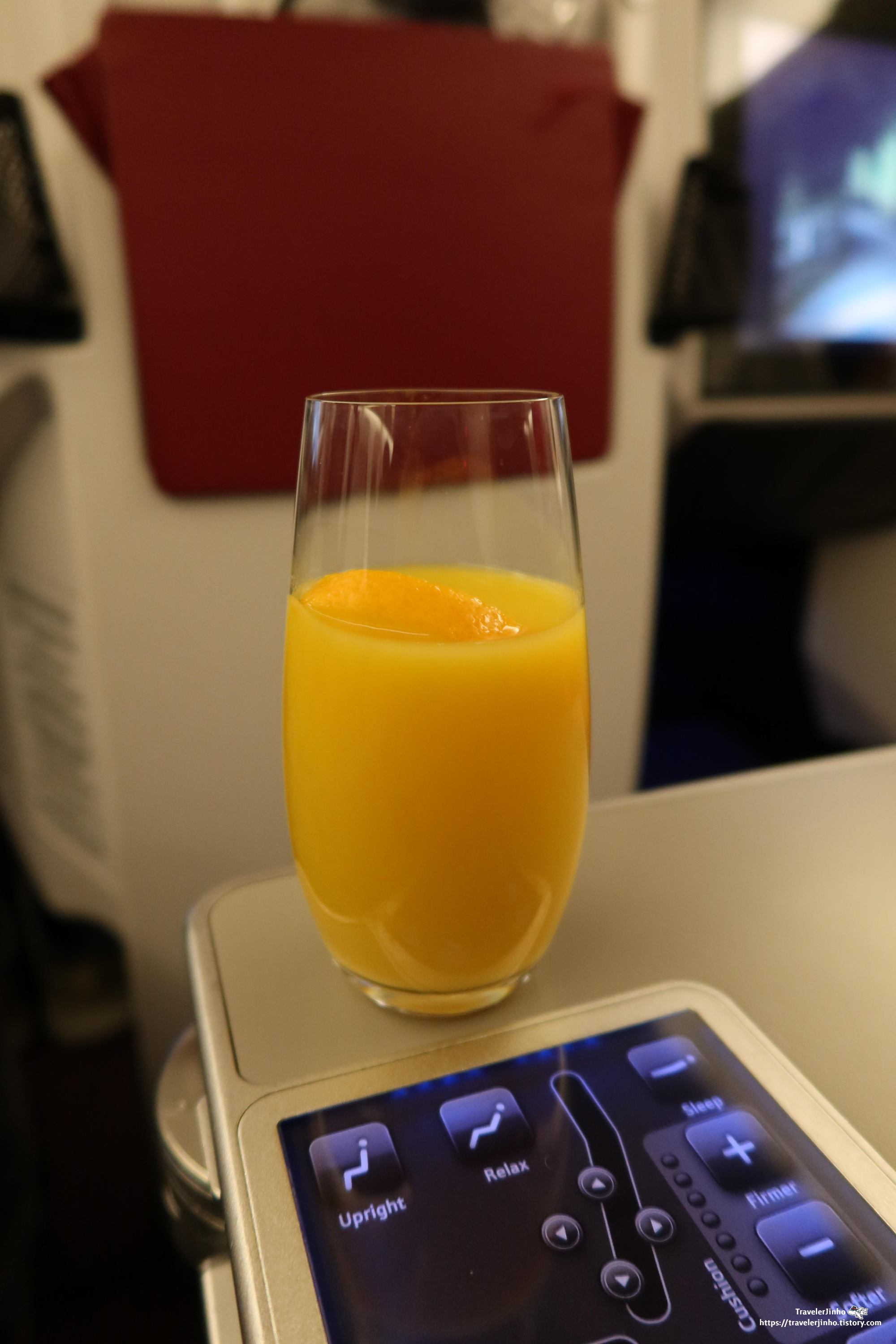 조금 지나 웰컴드링크를 나누어주었고 오렌지 주스를 선택했다.