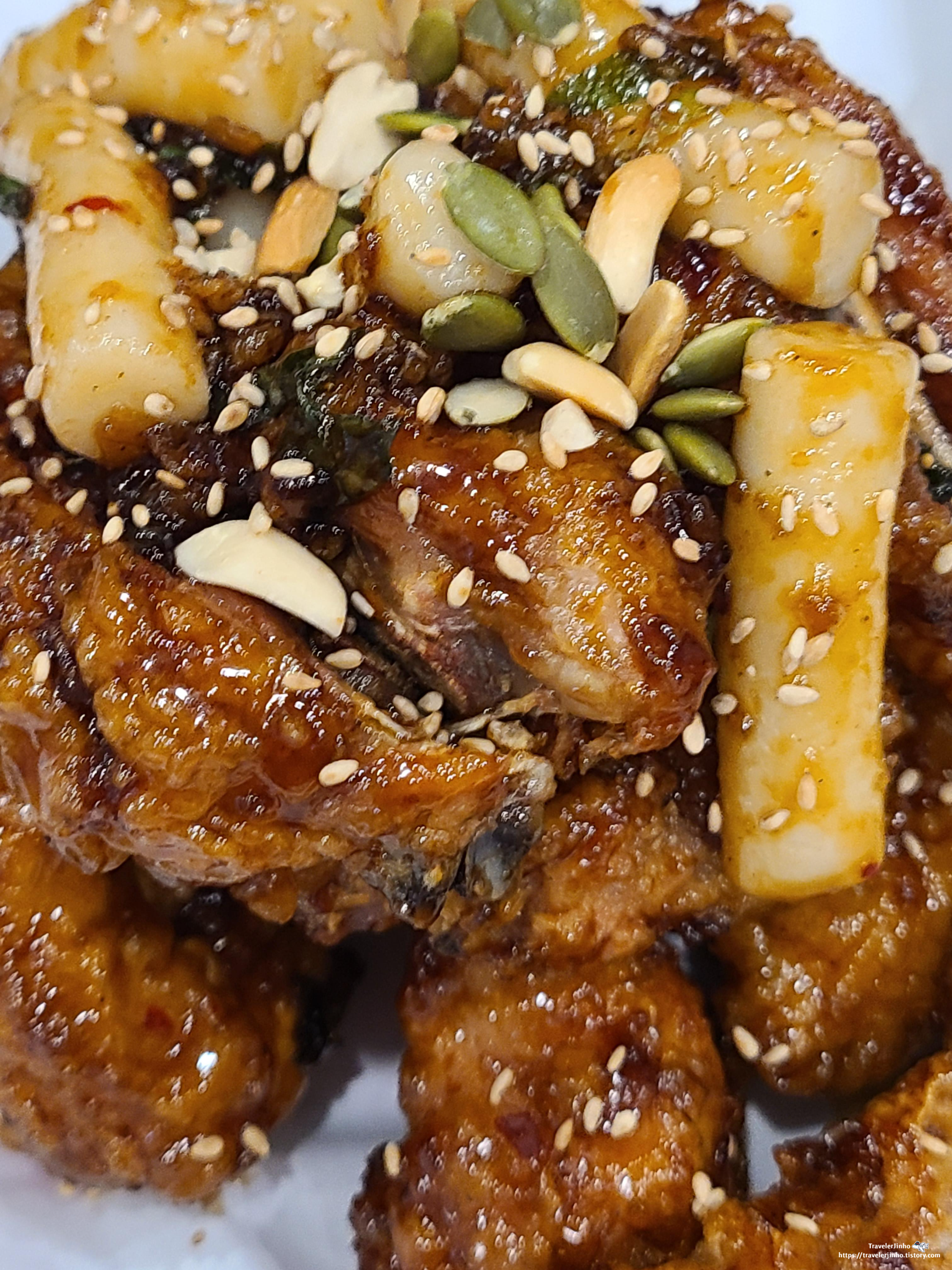 쫄간장치킨은 간장코팅된 치킨에 떡볶이 떡, 견과류, 깨가 뿌려져서 나왔다.